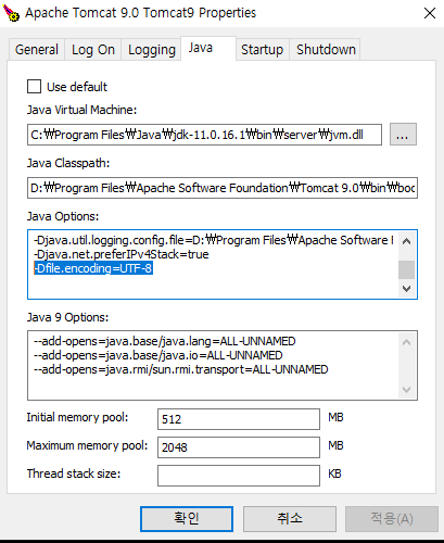 2. WAS의 jvm 실행시 -Dfile.encoding=UTF-8이 포함되어 있는지 확인